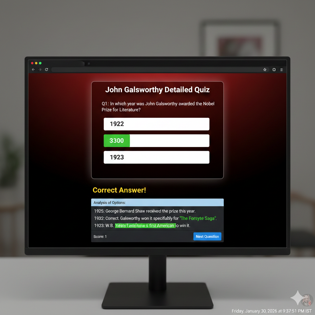John Galsworthy Detailed Quiz John Galsworthy Quiz Question goes here… Score: 0 Next Question