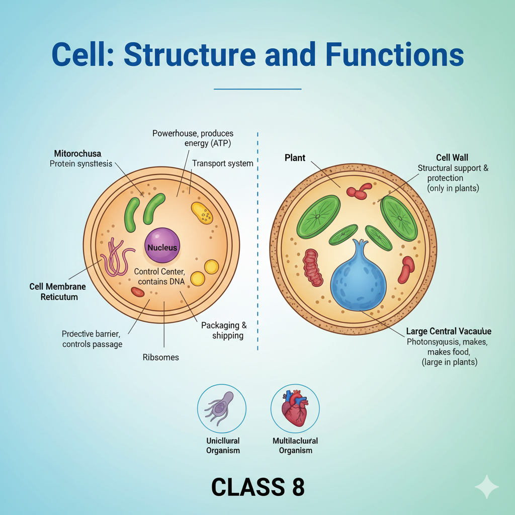 कक्षा 8 विषय विज्ञान कोशिका: डिजिटल लेसन कोशिका: संरचना एवं प्रकार्य 1. कोशिका क्या है? कोशिका सजीवों की मूलभूत इकाई…