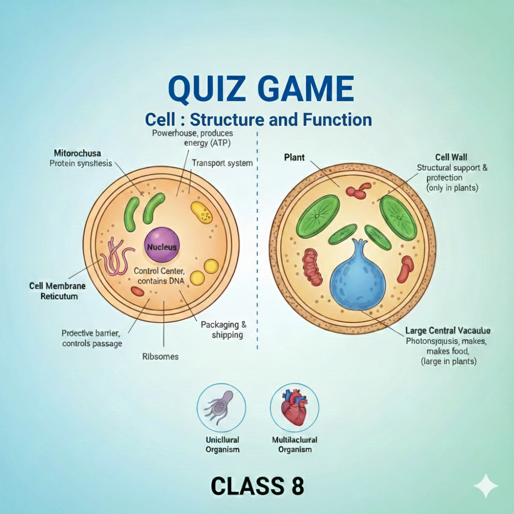 कक्षा 8: कोशिका संरचना एवं प्रकार्य क्विज कोशिका संरचना एवं प्रकार्य क्विज प्रश्न: 1 / 30 | स्कोर: 0 प्रश्न…