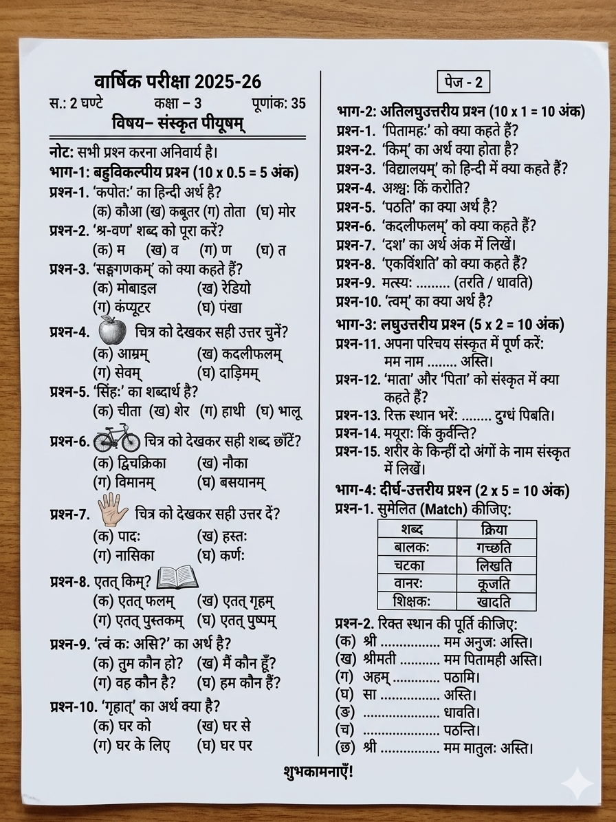 ”वार्षिक परीक्षा, मॉडल पेपर- 2025-26, कक्षा- 3, विषय- संस्कृत पीयूषम: MOST IMPORTANT QUESTIONS “