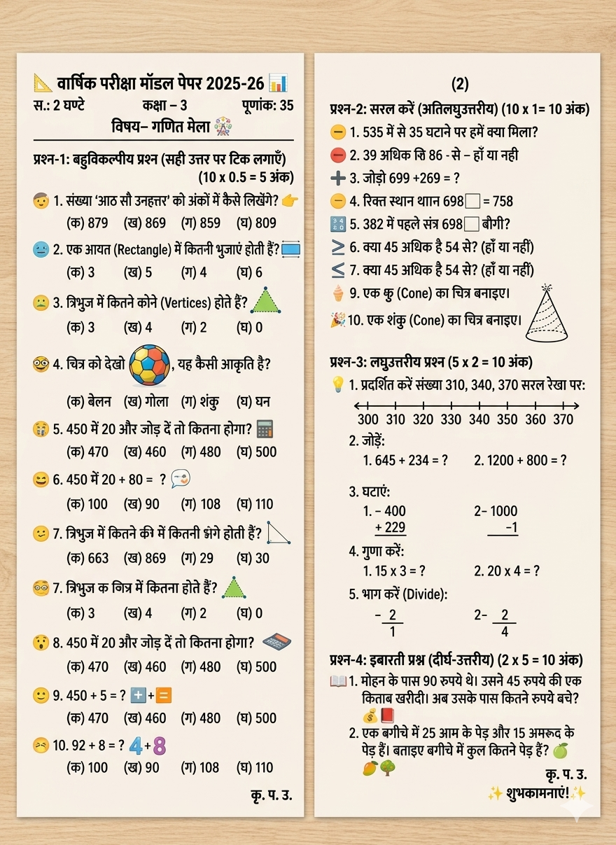 ”🧑🏫वार्षिक परीक्षा मॉडल पेपर 2025-26, कक्षा- 3, विषय- गणित- MOST IMPORTANT QUESTIONS”