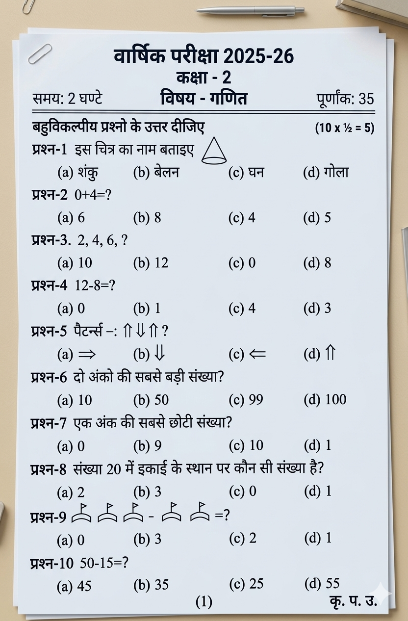 🧑🏫वार्षिक परीक्षा, मॉडल पेपर, कक्षा- 2, विषय- गणित- MOST IMPORTANT QUESTIONS”