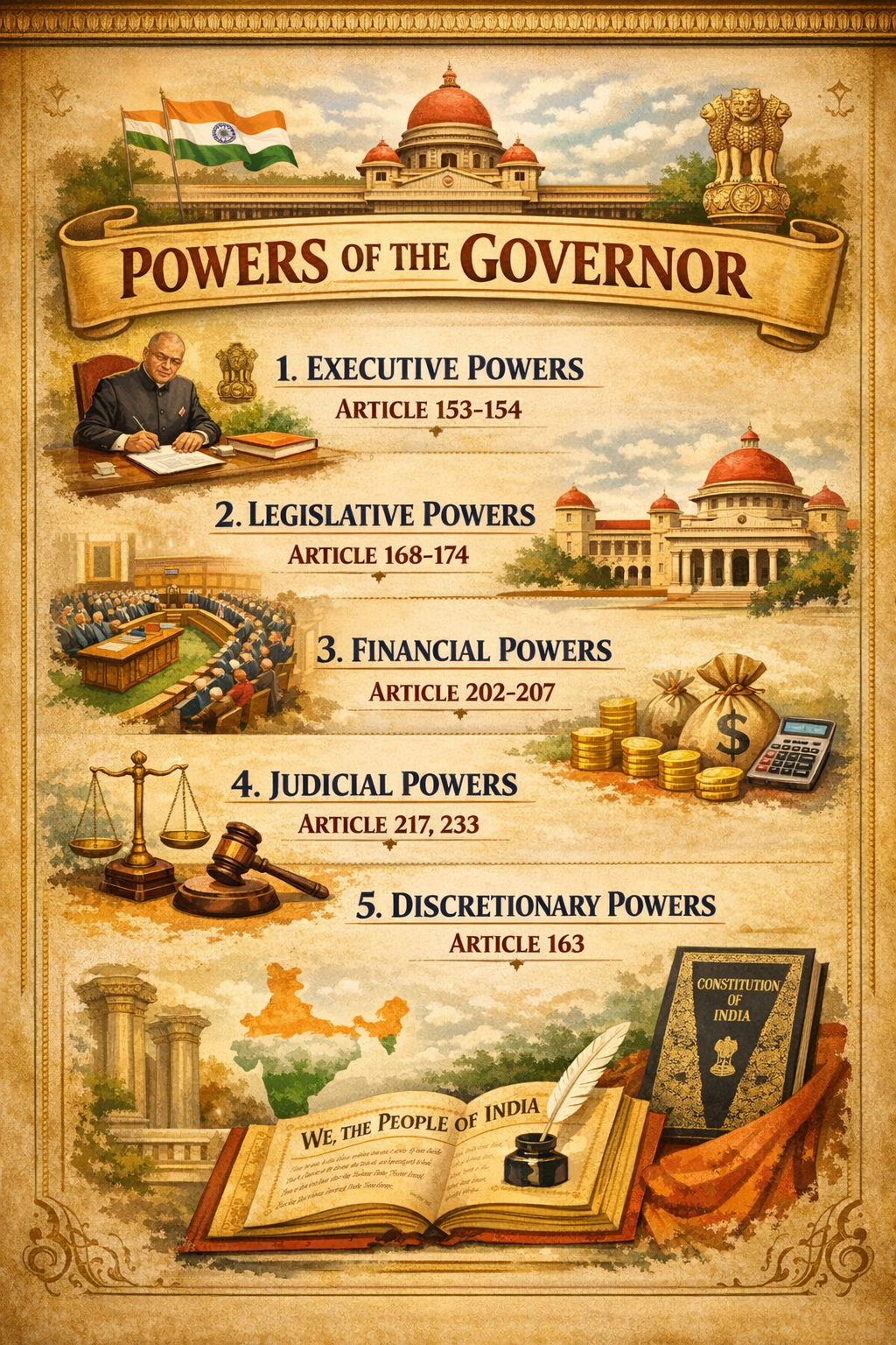 1. कार्यकारी शक्तियाँ (Executive Powers) 2. विधायी शक्तियाँ (Legislative Powers) 3. न्यायिक शक्तियाँ (Judicial Powers) शक्ति का प्रकार मुख्य अनुच्छेद कार्यपालिका शक्ति अनुच्छेद 154 क्षमादान की शक्ति अनुच्छेद 161 अध्यादेश…