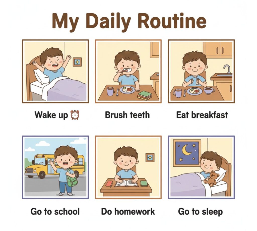 बच्चों की डेली रूटीन (Daily Routine) के लिए यहाँ कुछ उपयोगी वाक्य दिए गए हैं। ये वाक्य सुबह उठने से लेकर रात को सोने तक के हैं, जो बच्चों को इंग्लिश सिखाने में बहुत मददगार होंगे।