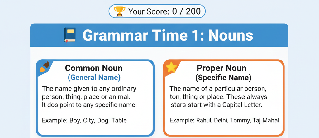📘 Noun (संज्ञा) की परिभाषा और प्रकार Game खेलो और Noun सीखो! 🎮 Interactive Noun Quiz for Students Noun (संज्ञा):…