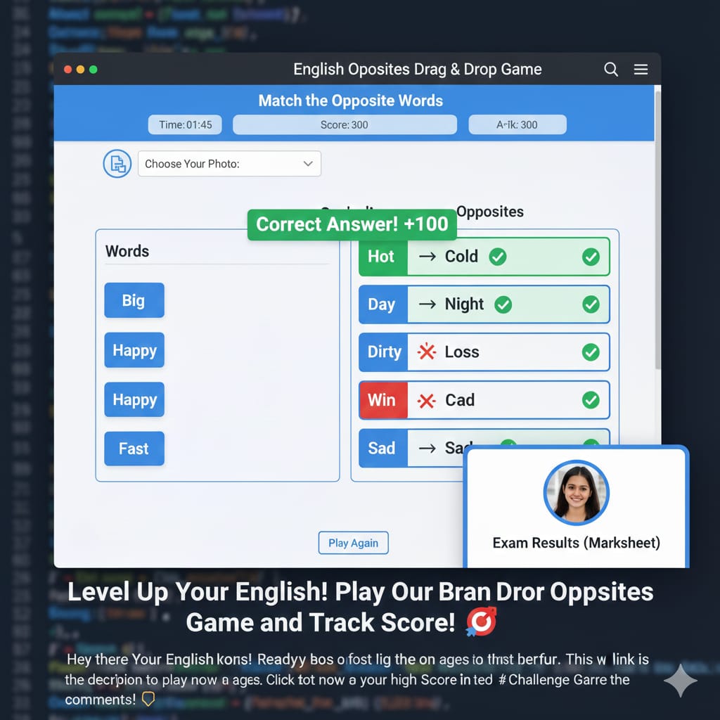 English Opposites Drag & Drop Game English Opposites Game स्कोर: 0 समय शेष: 120s गेम समाप्त! अपनी फोटो अपलोड करें…