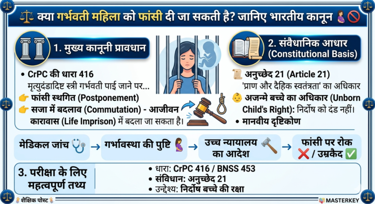 Spread the love क्या आप जानते हैं कि भारतीय कानून में गर्भवती महिला को फांसी देने पर क्या प्रावधान है? इस लेख / पोस्ट में हम विस्तार से समझेंगे CrPC की धारा 416 और नए कानून BNSS की धारा 453 के बारे में। क्या संविधान का अनुच्छेद 21 एक निर्दोष अजन्मे बच्चे की जान बचाने … Continue reading ⚖️ क्या गर्भवती महिला को फांसी (मृत्युदण्ड) दी जा सकती है?🤰🚫: POWER OF THE INDIAN CONSTITUTION👍