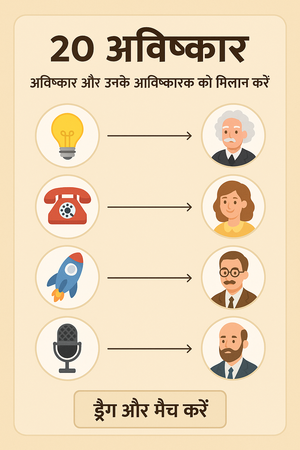 अविष्कार और अविष्कारक – ड्रैग एंड मैच गेम 🔍 अविष्कार और उनके अविष्कारकों का मिलान करें 💡 बल्ब 📞 टेलीफोन…
