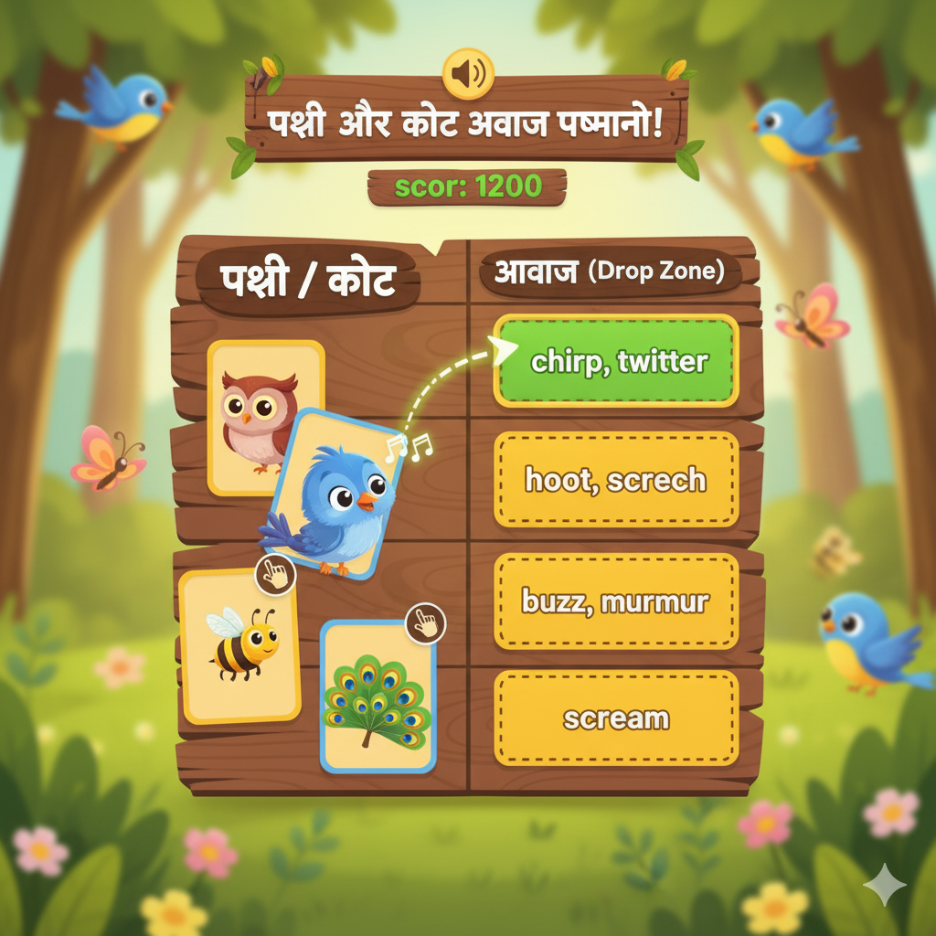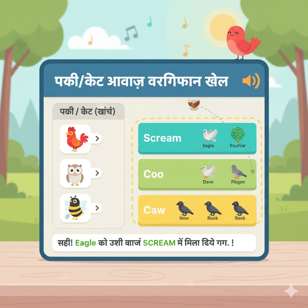 पशु-पक्षी आवाज़ वर्गीकरण खेल (स्कोरिंग) पक्षी/कीट आवाज़ वर्गीकरण खेल 📢 (संपूर्ण 22 आइटम) प्रत्येक पक्षी/कीट को खींचकर (Drag) उसकी सही…