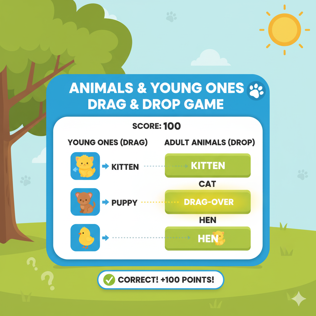 पशु ज्ञान ड्रैग एंड ड्रॉप (स्कोरिंग) पशु ज्ञान ड्रैग एंड ड्रॉप 🐾🔊 सही बच्चे/आवाज़ को उसके वयस्क/जीव पर खींचें और…