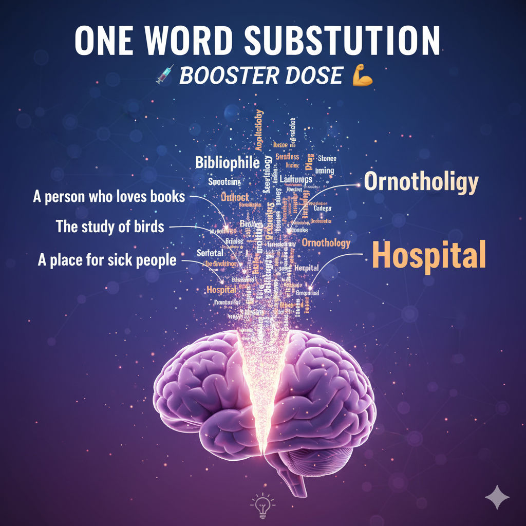 One-Word Substitution (वन-वर्ड सब्स्टीट्यूशन) वन-वर्ड सब्स्टीट्यूशन (One-Word Substitution) ऊपर ड्रॉपडाउन या बटन का उपयोग करके एक सब्स्टीट्यूशन चुनें। Previous Next