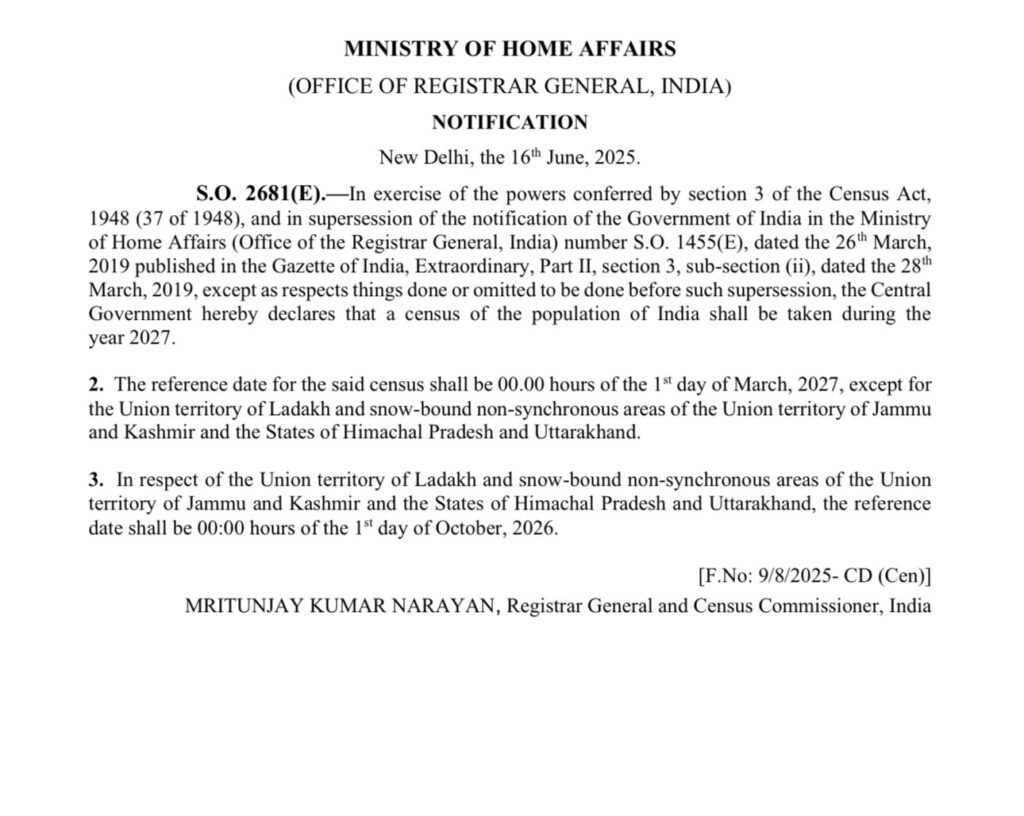 गृह मंत्रालय(भारत के महारजिस्ट्रार का कार्यालय)अधिसूचनानई दिल्ली, 16 जून, 2025.एस.ओ. 2681(ई). जनगणना अधिनियम, 1948 (1948 का 37) की धारा 3 द्वारा प्रदत्त शक्तियों का प्रयोग करते हुए, तथा भारत सरकार के गृह मंत्रालय (भारत के महारजिस्ट्रार का कार्यालय) की अधिसूचना संख्या एस.ओ. 1455(अ), दिनांक 26 मार्च, 2019, जो भारत के राजपत्र, असाधारण, भाग II, खंड 3, उप-खंड (ii), दिनांक 28 मार्च, 2019 में प्रकाशित हुआ था, को ऐसे अधिक्रमण से पूर्व की गई या करने से छूटी हुई बातों के सिवाय, केन्द्रीय सरकार एतद्द्वारा घोषित करती है कि भारत की जनसंख्या की जनगणना वर्ष 2027 के दौरान की जाएगी।2. उक्त जनगणना के लिए संदर्भ तिथि 1 मार्च, 2027 को 00.00 बजे होगी, सिवाय संघ राज्य क्षेत्र लद्दाख और संघ राज्य क्षेत्र जम्मू और कश्मीर तथा हिमाचल प्रदेश और उत्तराखंड राज्यों के बर्फ से ढके गैर-समकालिक क्षेत्रों के।3. लद्दाख संघ राज्य क्षेत्र तथा जम्मू-कश्मीर संघ राज्य क्षेत्र तथा हिमाचल प्रदेश और उत्तराखंड राज्यों के बर्फ से ढके गैर-समकालिक क्षेत्रों के संबंध में, संदर्भ तिथि 1 अक्टूबर, 2026 को 00:00 बजे होगी।[फा.सं.: 9/8/2025-सीडी (सीईएन)]मृत्युंजय कुमार नारायण, महापंजीयक और जनगणना आयुक्त, भारत
