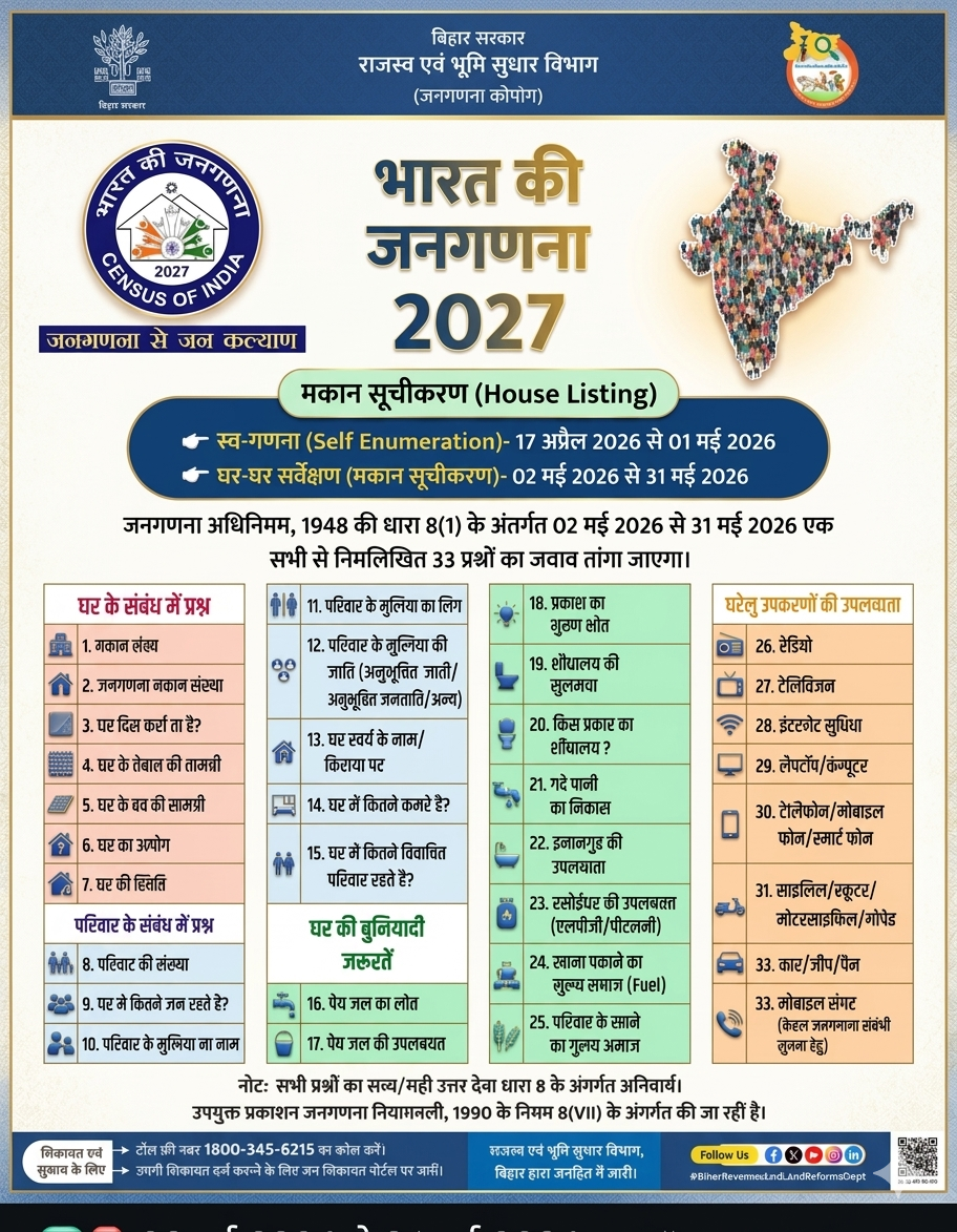 - प्रथम चरण (अप्रैल 2026 – सितंबर 2026): इस दौरान ‘मकान सूचीकरण’ (House-listing) और आवासों की गणना की जाएगी।