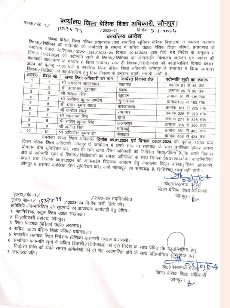 वर्तमान में संचालित जूनियर बेसिक स्कूलों में प्रमोशन प्रक्रिया के क्रम में आज जनपद जौनपुर का प्रमोशन प्रक्रिया की काउंसिलिंग सम्बन्धी आदेश जारी कर दिया गया है। जिसमें 5 व 6 जनवरी 2024 के विस्तृत कार्यक्रम दिया गया है। देखे आदेश।