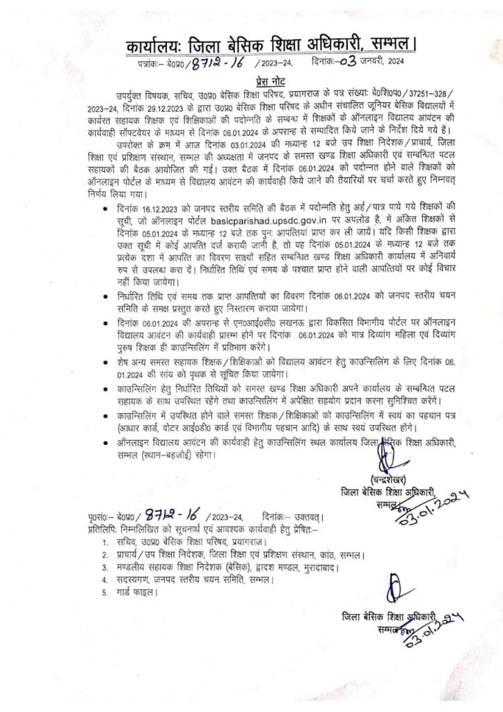 जूनियर बेसिक विद्यालयों में प्रमोशन प्रक्रिया के अंतर्गत जनपद सम्भल के आदेश इन 6 जनवरी को विकलांगो की काउंसिलिंग होगी उसके बाद अन्य अध्यापकों की सूची जारी की जाएगी देखें आदेश