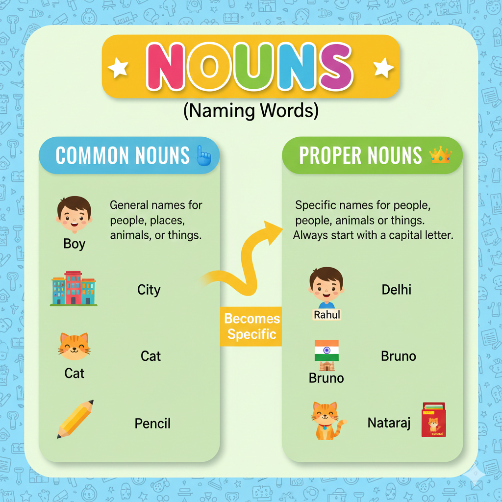 श्रेणी (Category)Common Noun (जातिवाचक)Proper Noun (व्यक्तिवाचक)हिंदी अर्थ (Meaning)