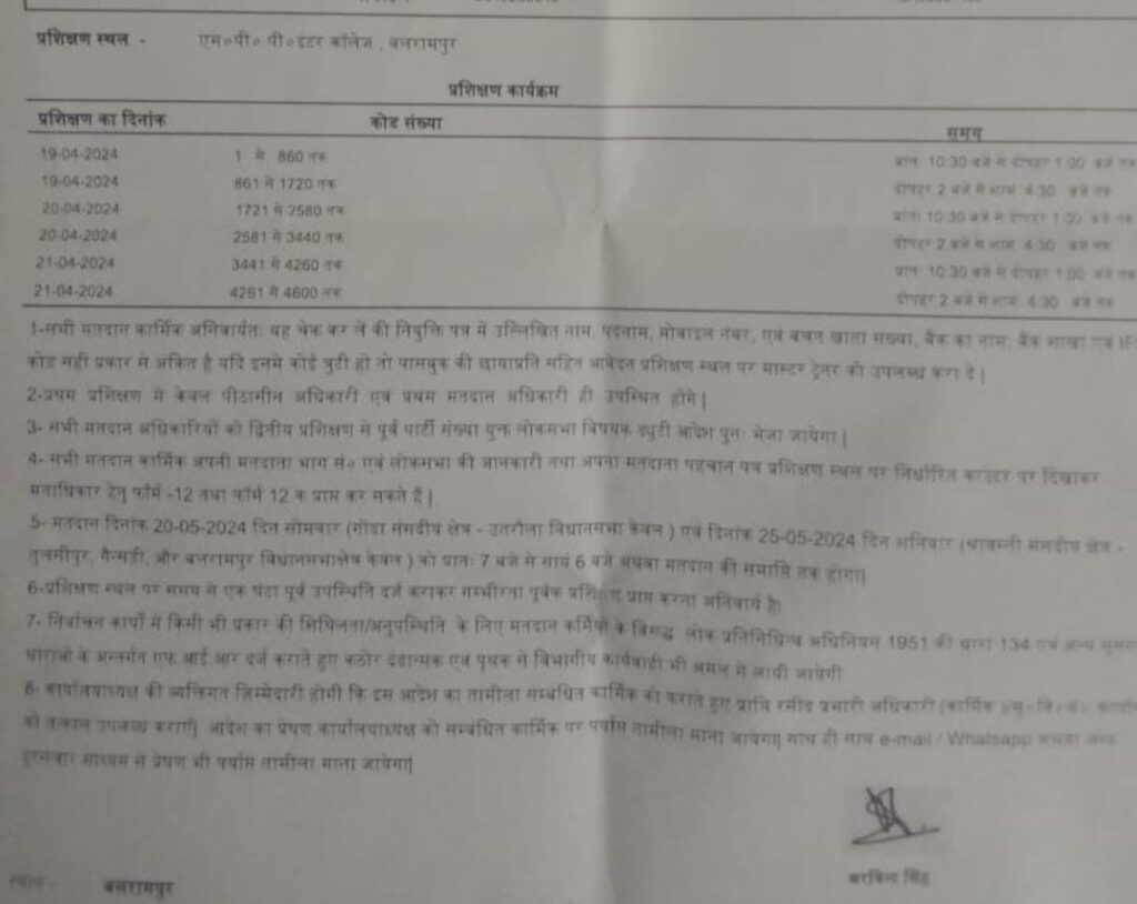 जनपद बलरामपुर में चुनाव प्रशिक्षण हेतु 3 दिन निर्धारित किये गए है यह प्रशिक्षण दिनाँक 19 अप्रैल 2024 से दिनाँक 21 अप्रैल 2024 तक MPP कॉलेज में होगा। देखें पूरी सूची।