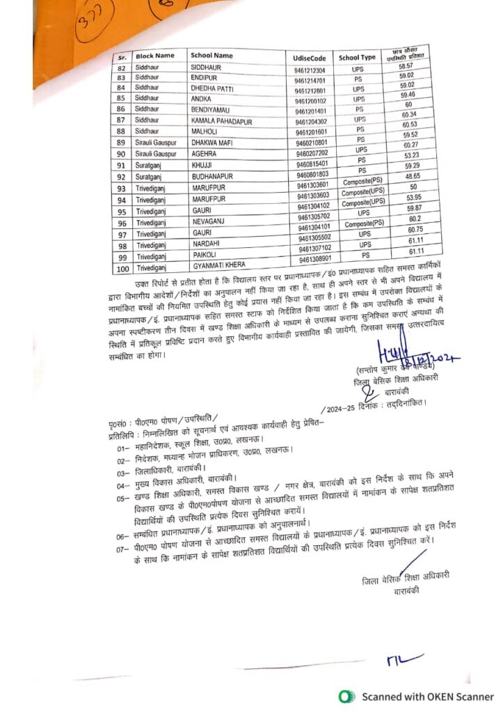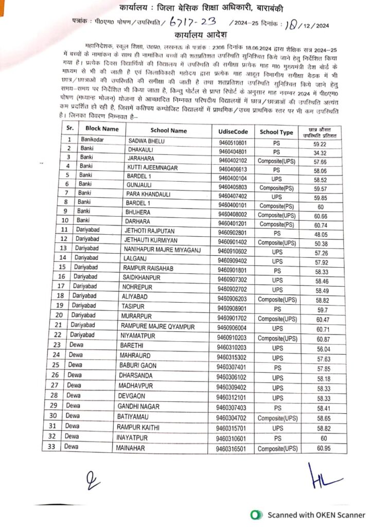 जनपद बाराबंकी में समीक्षा बैठक में कम उपस्थिति वाले विद्यालयों के प्रधानंध्यापकों से स्पष्टीकरण मांगा गया है देखें सूची