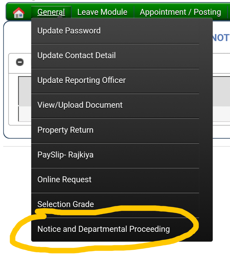 - इसके पश्चात General विकल्प में जाएं तथा सबसे अंत में दिया गया विकल्प Notice and Departmental proceeding चुने