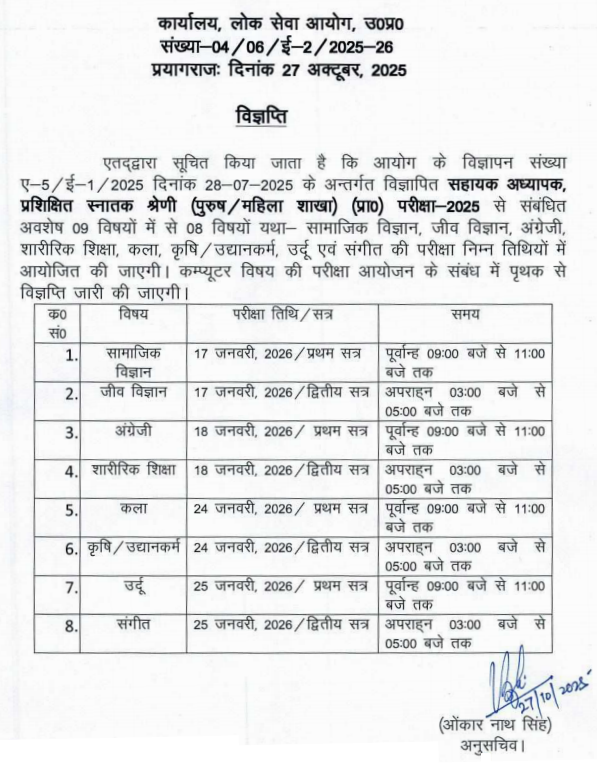 एतद्द्वारा सूचित किया जाता है कि आयोग के विज्ञापन संख्या ए-5/ई-1/2025 दिनांक 28−07−2025 के अंतर्गत विज्ञापित सहायक अध्यापक, प्रशिक्षित स्नातक श्रेणी (पुरुष/महिला शाखा) (प्रा०) परीक्षा-2025 से संबंधित अवशेष 09 विषयों में से 08 विषयों की परीक्षा निम्नलिखित तिथियों में आयोजित की जाएगी।