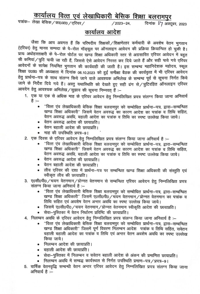 जैसा कि आप अवगत हैं कि परिषदीय शिक्षकों/शिक्षणेत्तर कर्मचारी के अवशेष वेतन भुगतान ( एरियर) हेतु मानव सम्पदा के पे-रोल मॉड्यूल पर ऑनलाइन आवेदन की प्रक्रिया क्रियान्वित हो चुकी है। प्रायः अधोहस्ताक्षरी के पेरोल पोर्टल पर खण्ड शिक्षा अधिकारी स्तर से अग्रसारित एरियर आवेदन में बहुत सी कमियां / त्रुटि पायी जा रही हैं, जिससे ऐसे आवेदन निरस्त कर दिये हैं और सही पाये गये एरियर आवेदनों के सापेक्ष नियमित भुगतान की कार्यवाही की जाती है। इस सम्बन्ध महानिदेशक महोदय, स्कूल शिक्षा उ0प्र0 की अध्यक्षता में दिनांक 06.10:2023 को हुई समीक्षा बैठक की कार्यवृत्त में भी एरियर आवेदन हेतु प्रार्थना-पत्र के साथ संलग्न किये जाने वाले आवश्यक अभिलेख के सम्बन्ध पूर्व से सूचना निर्गत किये जाने के निर्देश दिये गये हैं। अस्तु यथास्थिति को देखते हुए सही ढंग से / त्रुटिरहित ऑनलाइन एरियर आवदेन हेतु आवश्यक अभिलेख / सुझाव की सूचना निम्नवत् हैं :-