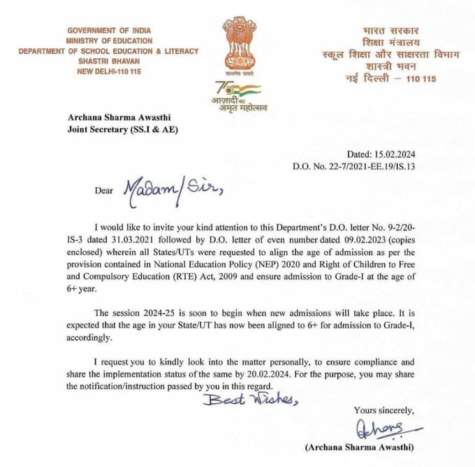 नवीन शिक्षा नीति 2020 के अंतर्गत कक्षा 1 में प्रवेश लेने हेतु छात्र की आयु 6 वर्ष से कम नहीं होनी चाहिए। देखें आयु के सम्बन्ध में ये दो आदेश।