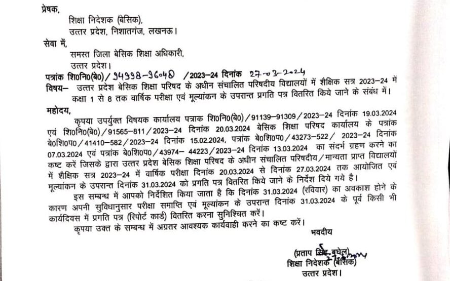 कष्ट करें जिसके द्वारा उत्तर प्रदेश बेसिक शिक्षा परिषद के अधीन संचालित परिषदीय / मान्यता प्राप्त विद्यालयों में शैक्षिक सत्र 2023-24 में वार्षिक परीक्षा दिनांक 20.03.2024 से दिनांक 27.03.2024 तक आयोजित एवं मूल्यांकन के उपरान्त दिनांक 31.03.2024 को प्रगति पत्र वितरित किये जाने के निर्देश दिये गये है।