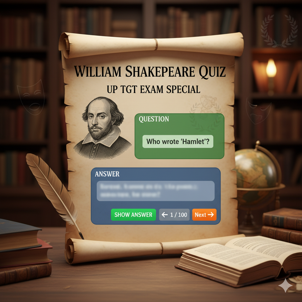 William Shakespeare Quiz for UP TGT Exam William Shakespeare Quiz (TGT Special) Total Questions: 100 (Example shown: 5) Question Answer…