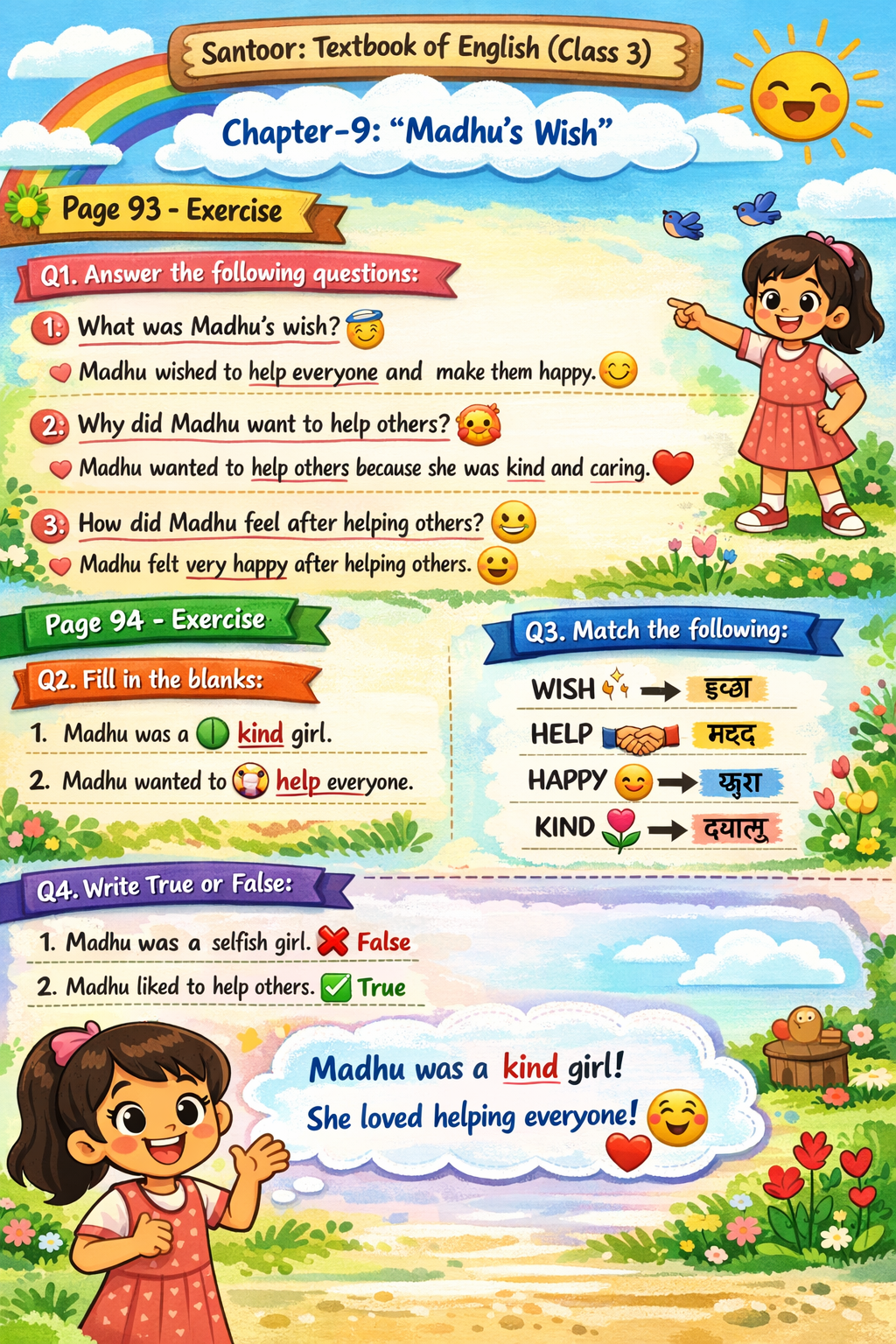 Book- Santoor, Class- 3rd, Chapter- 9th ‘Madhu’s wish’ A. Answer the following निम्नलिखित प्रश्नों के उत्तर दीजिए। What did Madhu…
