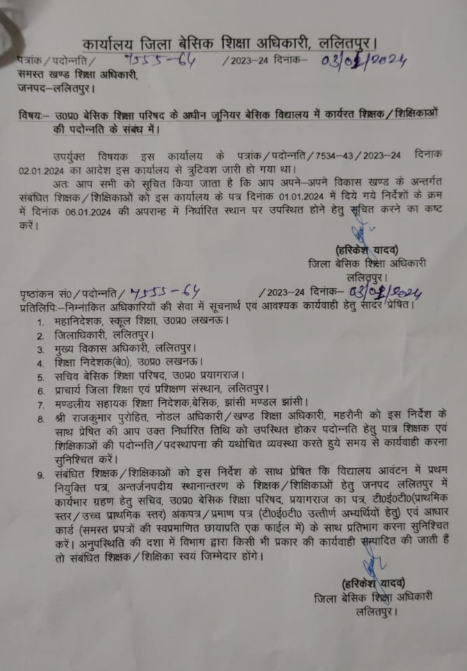 जिला बेसिक शिक्षा अधिकारी द्वारा प्रमोशन आदेश निरस्त होने के बाद पुनः प्रमोशन प्रक्रिया सम्पन्न कराने हेतु आदेश जारी कर दिया गया है। पढ़े पूरा आदेश