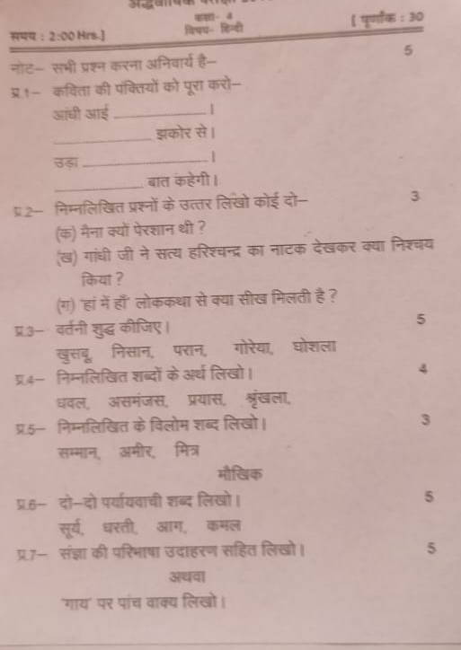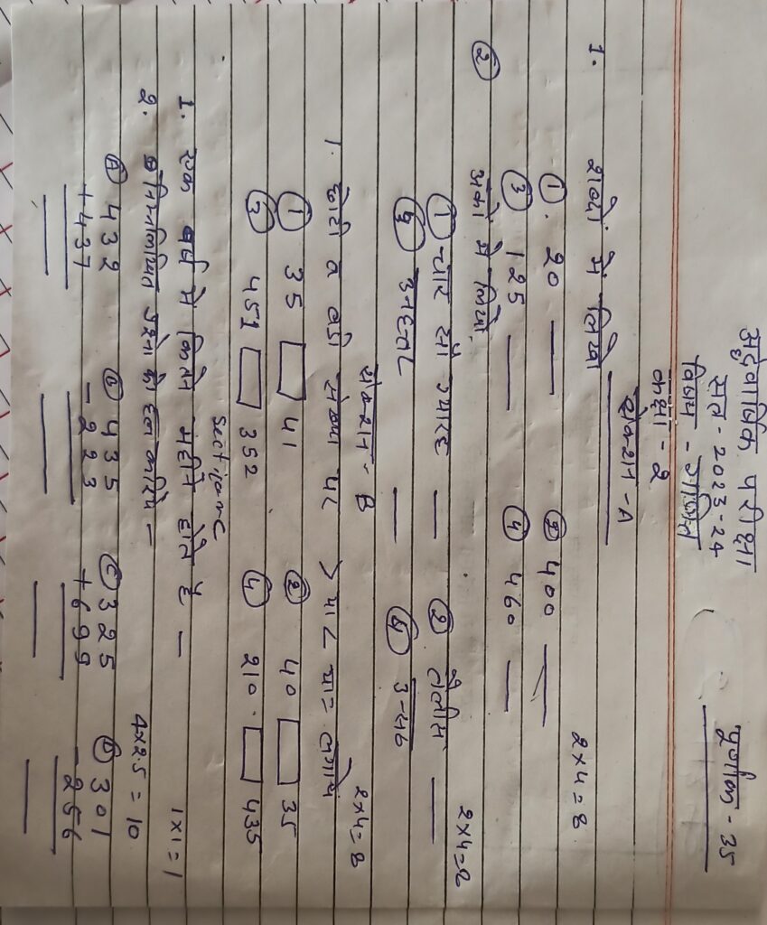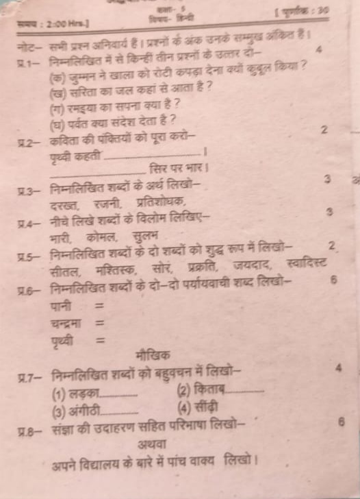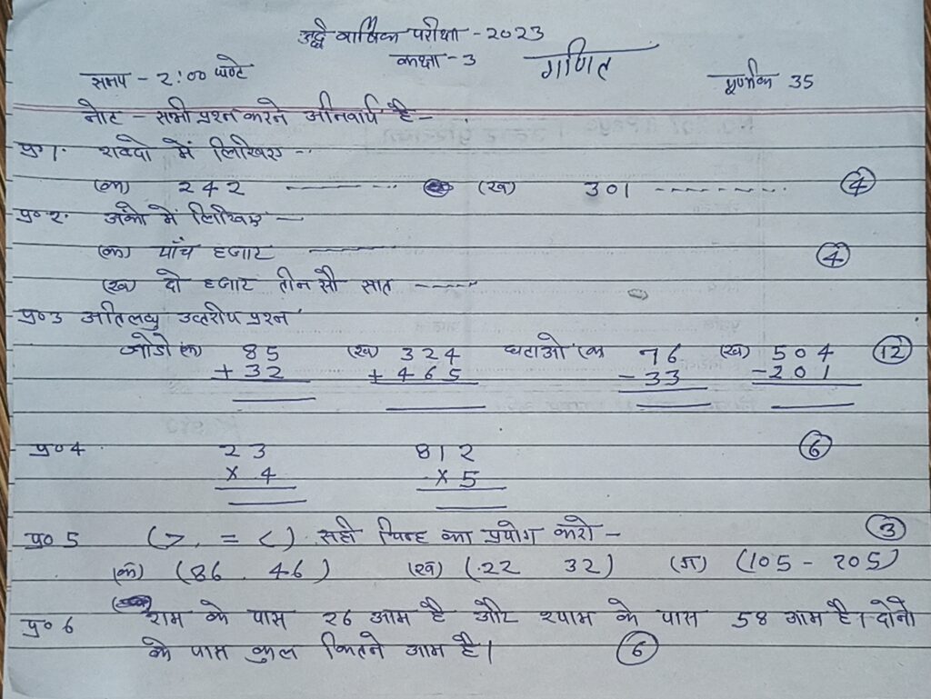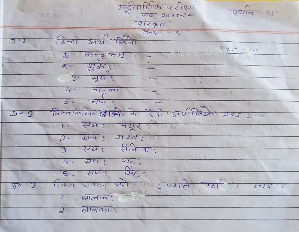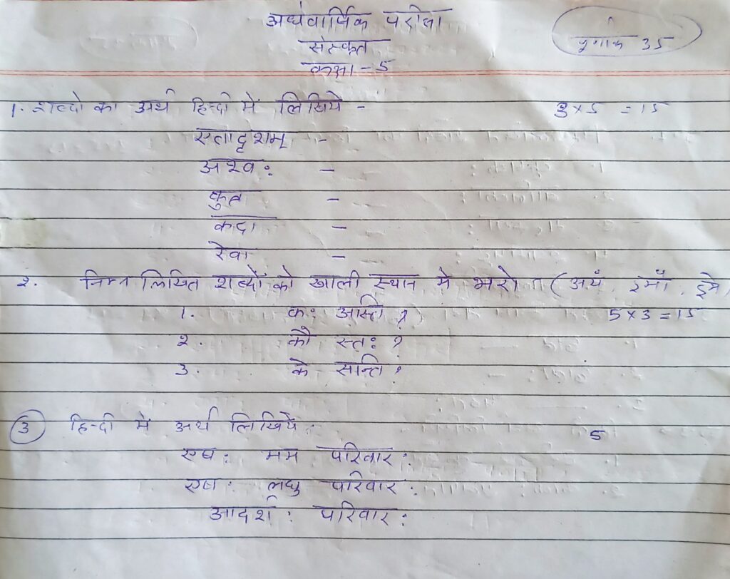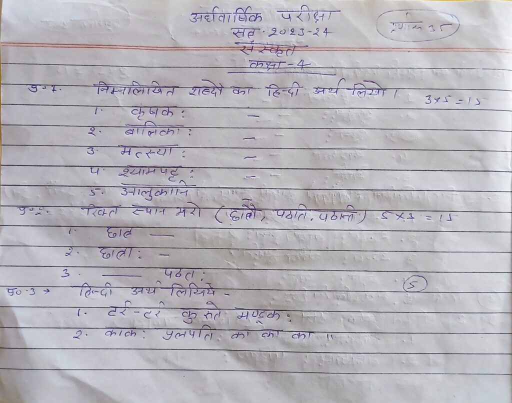 अर्धवार्षिक परीक्षा सैंपल परीक्षा पेपर कक्षा 2 से कक्षा 5 लिखित परीक्षा