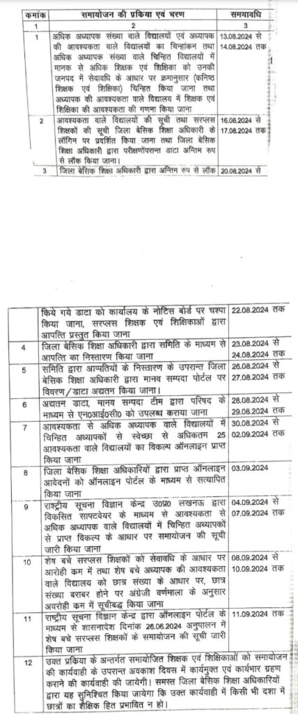 परिषदीय विद्यलयों में अध्यापकों के समायोजन की चरणवार तिथियां नीचे दिए गए आदेशानुसार निम्नलिखित हैं देखें पूरा आदेश।