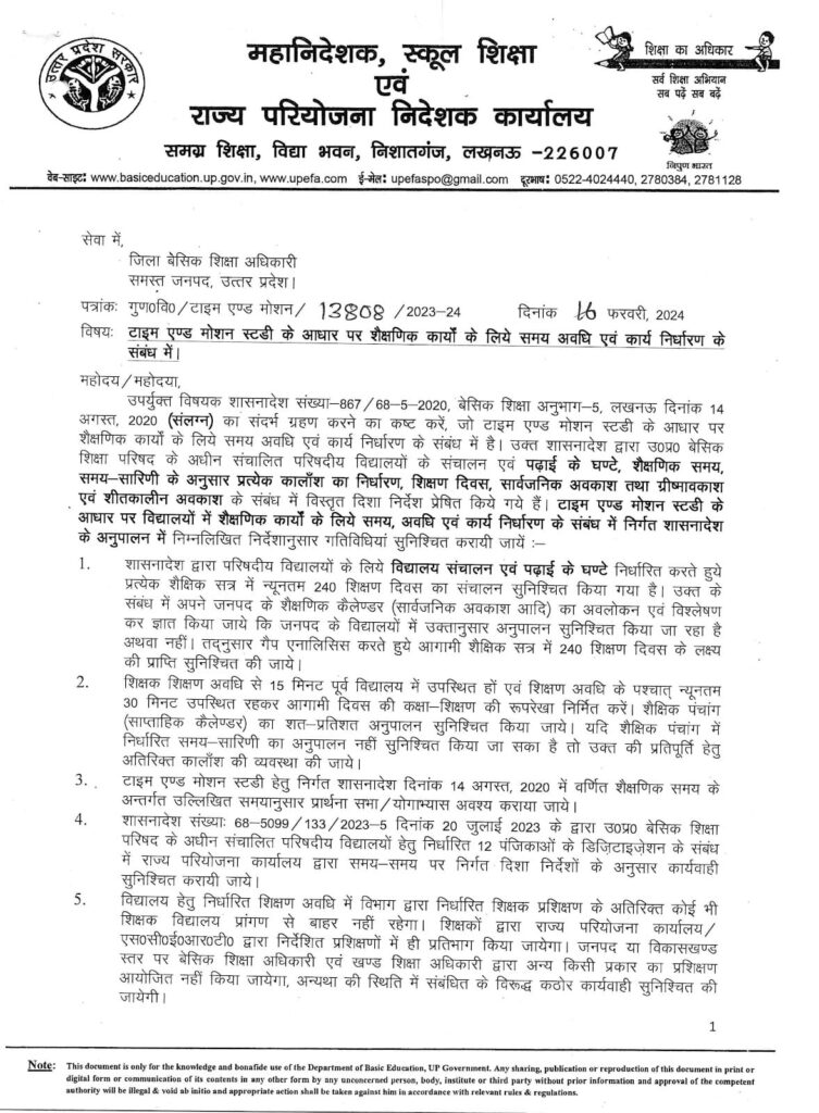 पत्रांकः गुण०वि०/टाइम एण्ड मोशन / 13808/2023-24 दिनांक 16 फरवरी, 2024 विषयः टाइम एण्ड मोशन स्टडी के आधार पर शैक्षणिक कार्यों के लिये समय अवधि एवं कार्य निर्धारण के संबंध में।