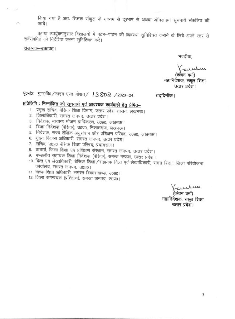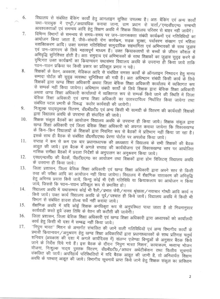 - कृपया उपर्युक्तानुसार विद्यालयों में पठन-पाठन की व्यवस्था सुनिश्चित कराने के लिये अपने स्तर से सर्वसंबंधित को निर्देशित करना सुनिश्चित करें।