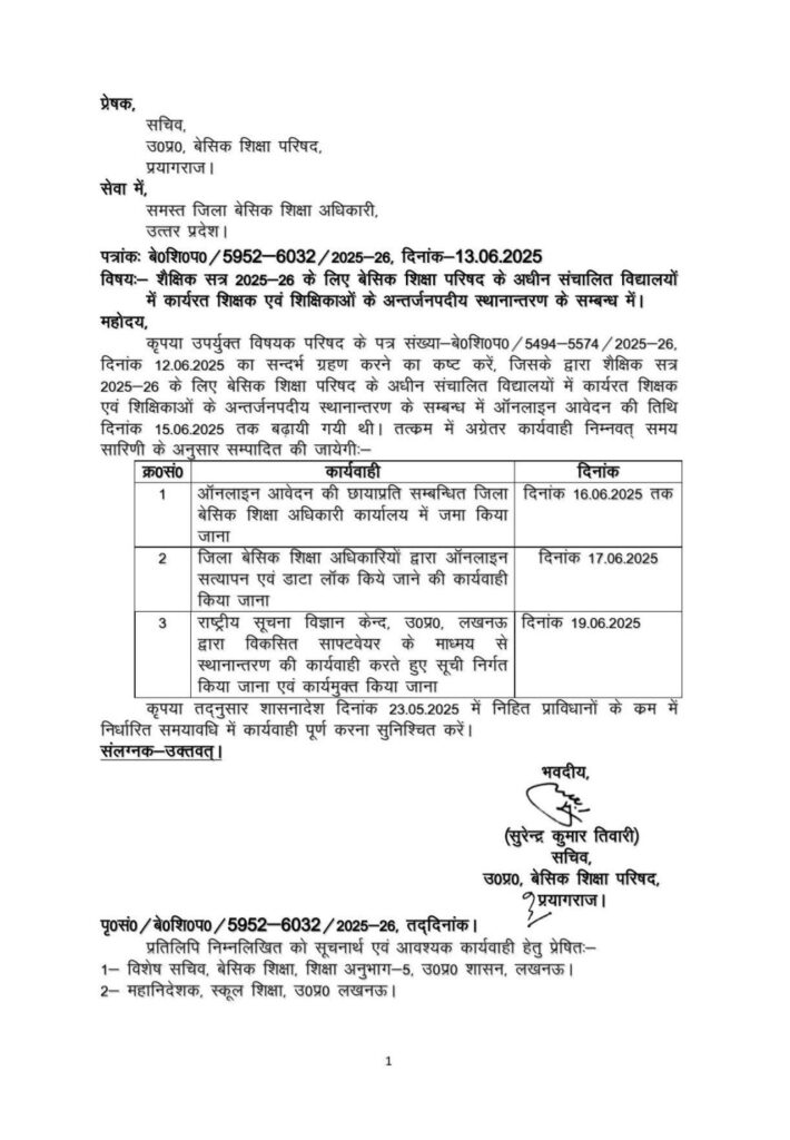उत्तर प्रदेश के बेसिक शिक्षा परिषदीय विद्यालयों में शुरू हुए अंतर्जनपदीय स्थानांतरण में नई अपडेट सामने आई है जिसमें पत्रावली जमा करने वो अन्य कुछ नई तिथियों के संबंध में आदेश निर्गत किया गया है देखें आदेश