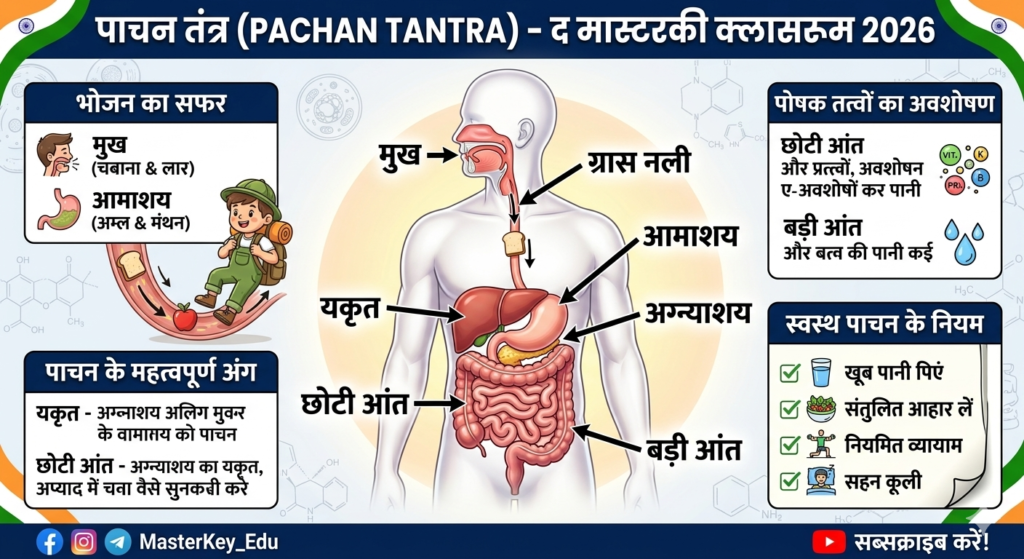 मानव शरीर की जटिलताओं को समझना न केवल विज्ञान के विद्यार्थियों के लिए बल्कि हर व्यक्ति के लिए आवश्यक है। पाचन तंत्र की यह प्रक्रिया हमें सिखाती है कि हम जो कुछ भी ग्रहण करते हैं, उसका हमारे शरीर पर गहरा प्रभाव पड़ता है। प्रतियोगी परीक्षाओं की दृष्टि से अंगों के कार्य और एंजाइमों की भूमिका को याद रखना आपको अच्छे अंक दिला सकता है। अंत में, “स्वस्थ रहें, शिक्षित रहें और MASTERKEY के साथ आगे बढ़ें!”