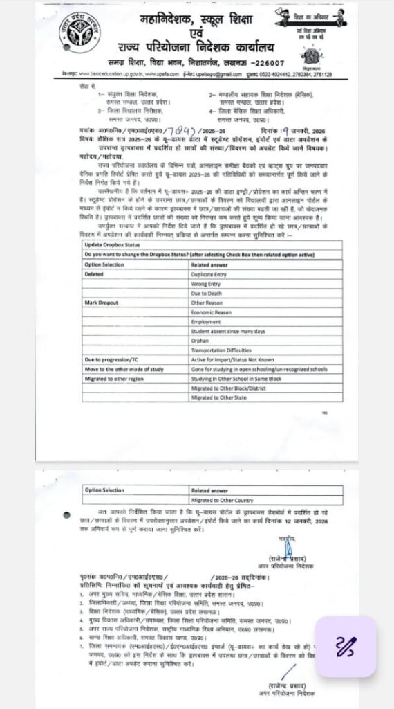 शैक्षिक सत्र 2025-26 के लिए यू-डाइस प्लस पोर्टल पर छात्र प्रोग्रेशन, इम्पोर्ट और डेटा अपडेशन के उपरान्त ड्रॉपबॉक्स में प्रदर्शित हो रहे छात्र/छात्राओं के विवरण को अपडेट करने के संबंध में यह महत्वपूर्ण निर्देश जारी किया गया है।