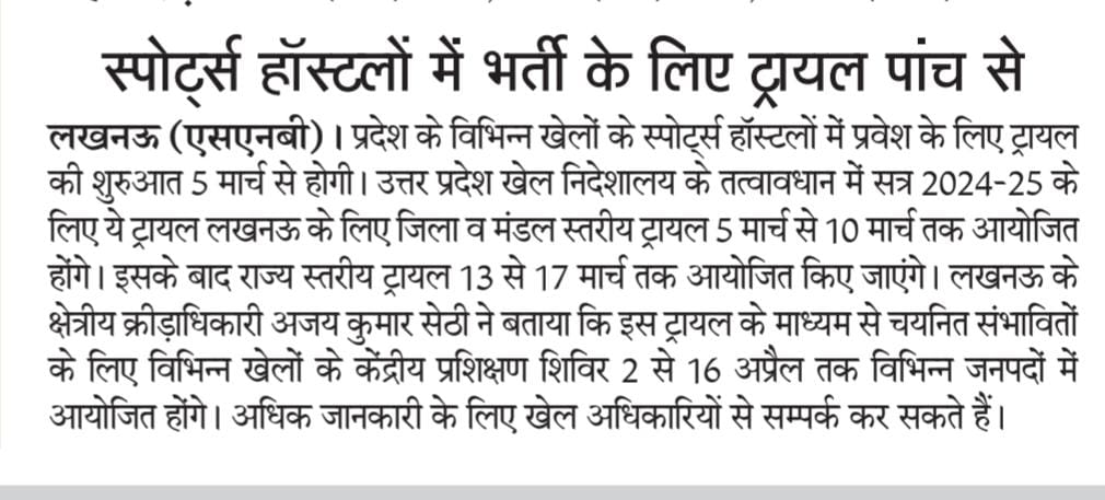 उत्तर प्रदेश क्रिकेट एसोसिएशन द्वारा आयोजित ट्रायल अंडर 14-16 व 19-23 सभी वर्गो के 2024-25 के लिए आवेदन ऑनलाइन पंजीकरण के माध्यम से होगा आनलाइन पंजीकरण की साइट registration .upca.tv पर ट्रायल फार्म भर सकते हैं।