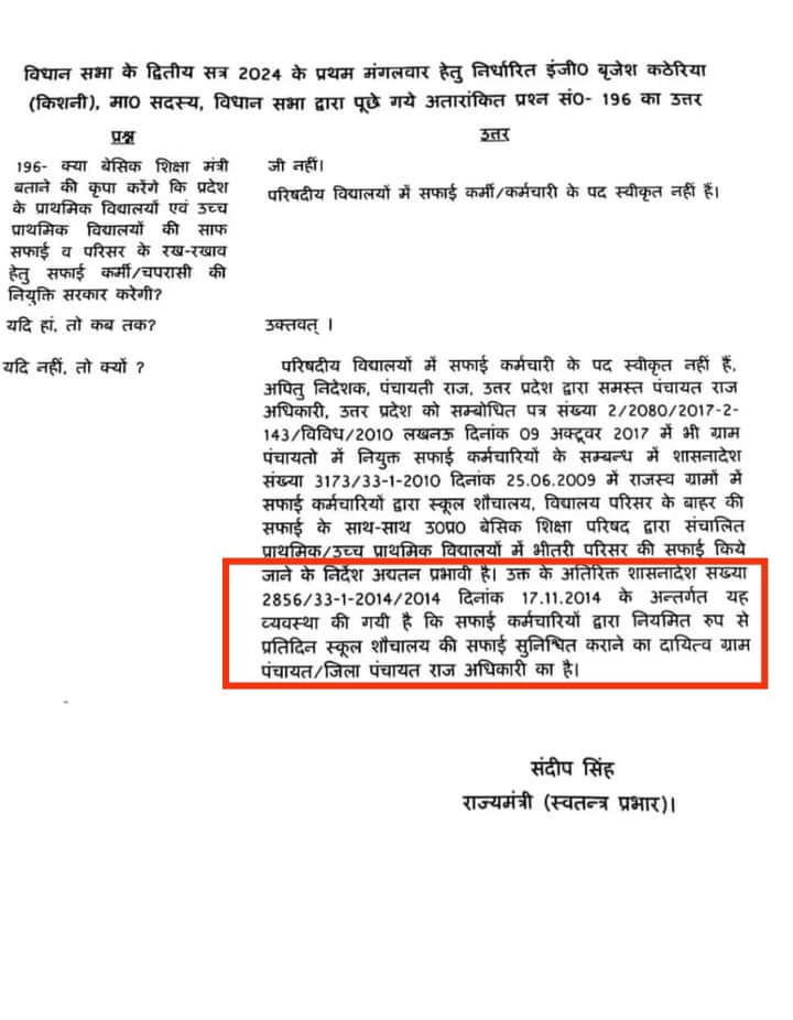 प्रश्न क्या बेसिक शिक्षा मंत्री बताने की कृपा करेंगे कि प्रदेश के प्राथमिक विद्यालयों एवं उच्च प्राथमिक विद्यालयों की साफ सफाई व परिसर के रख-रखाव हेतु सफाई कर्मी/चपरासी की नियुक्ति सरकार करेगी?